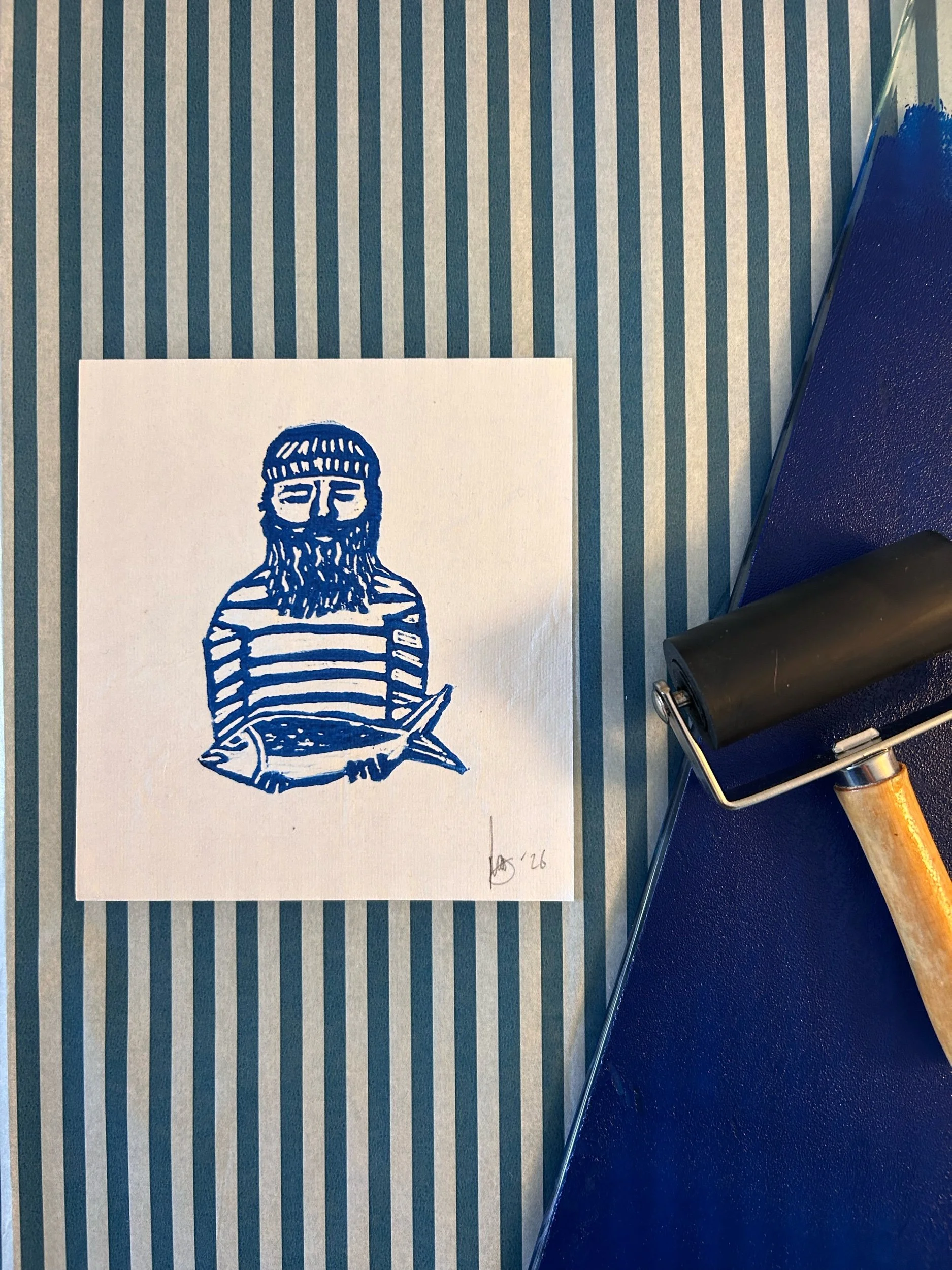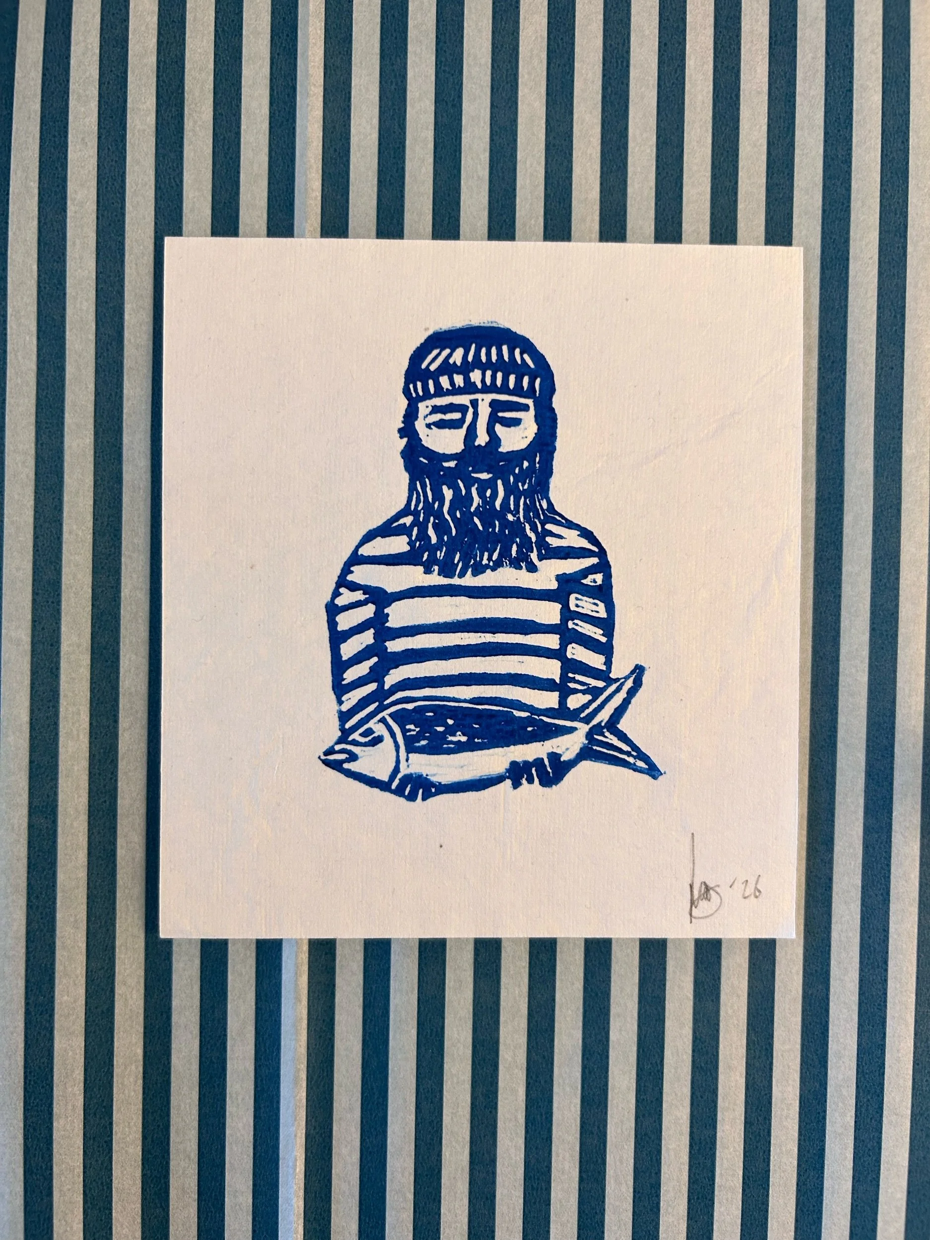 This signed hand-carved lino print captures the quiet pride of a fisherman holding his catch.