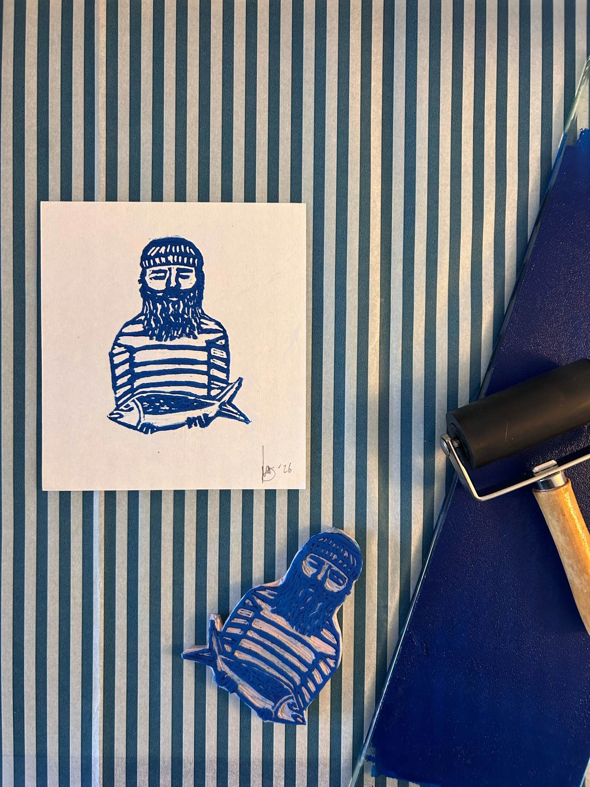 Bold, expressive and carefully carved by me Padraig, this piece is a striking contrast, with rich blue ink and soft negative space bringing depth to the composition.
